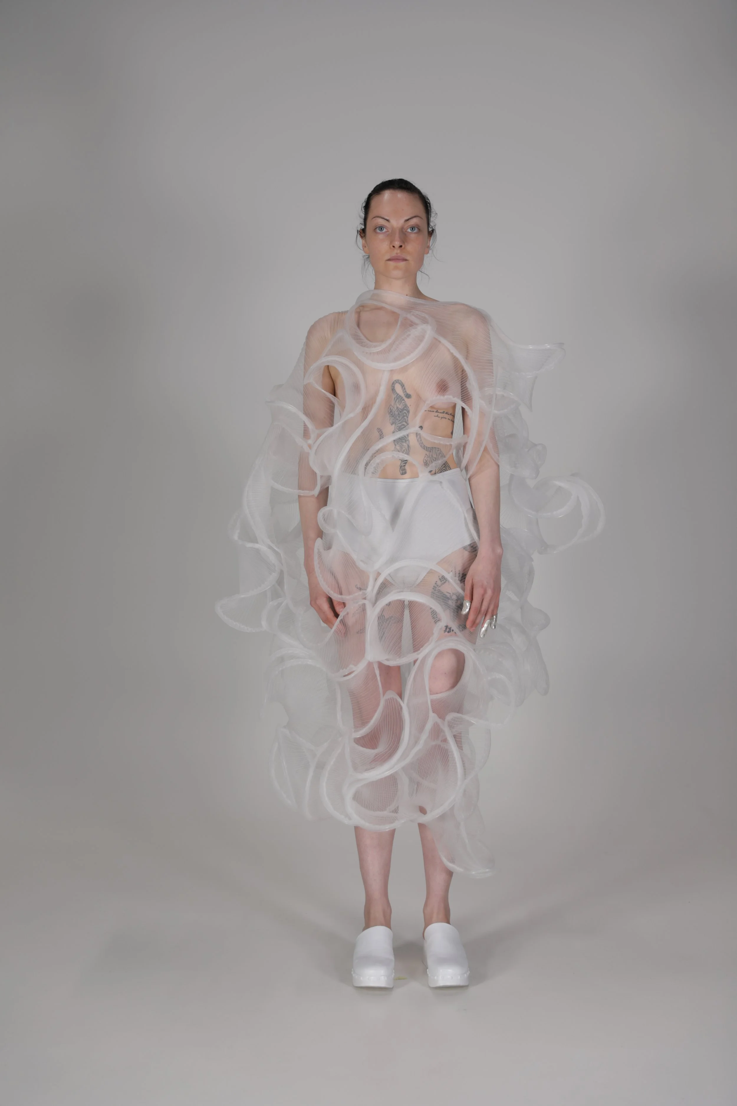 Each garment in the collection is created in improvised sessions with another person by manipulating material and draping it on a live body. The base of the sessions is a self-invented pattern cutting method which aims to create experiences and connections with the other person.